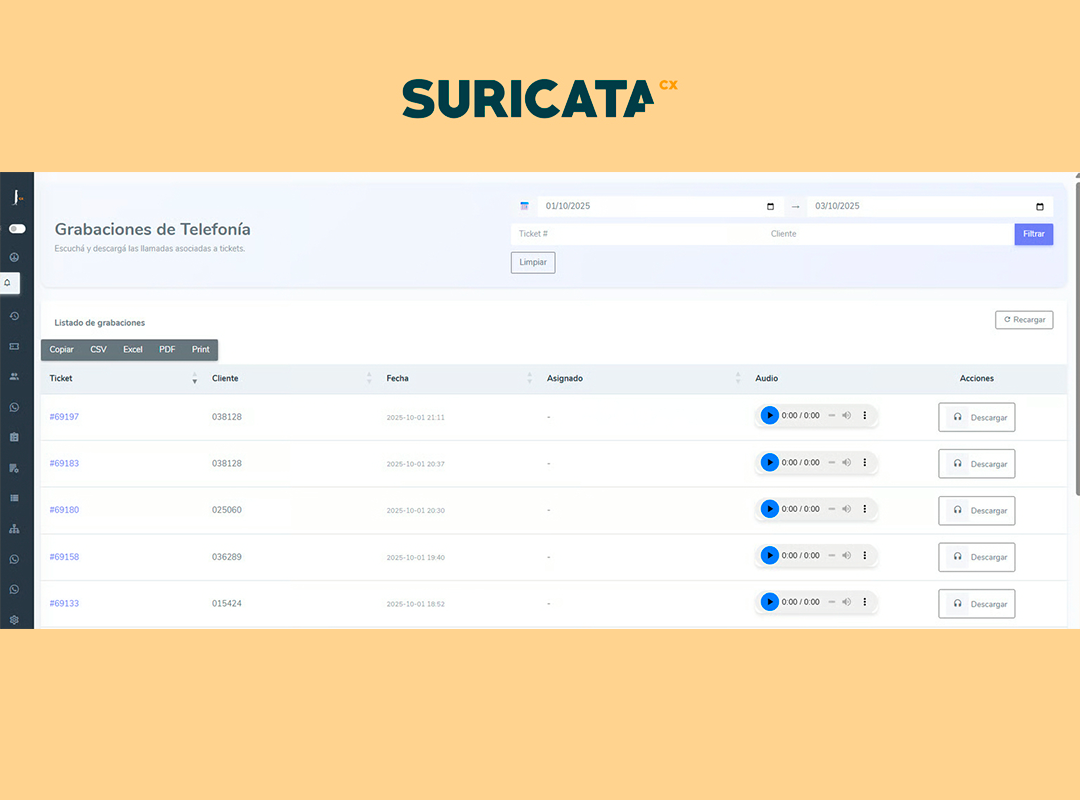 Además de visualizar y descargar las grabaciones de manera individual, el sistema permite exportar la información completa en distintos formatos, como CSV, Excel o PDF, o hacer una impresión directa.